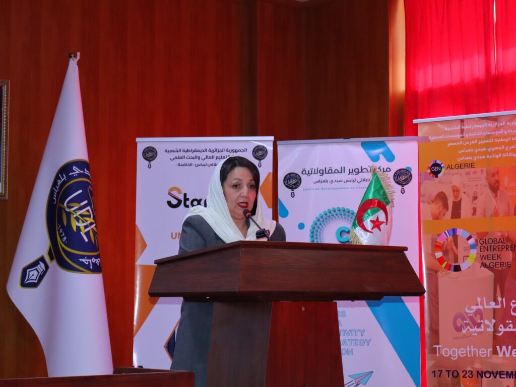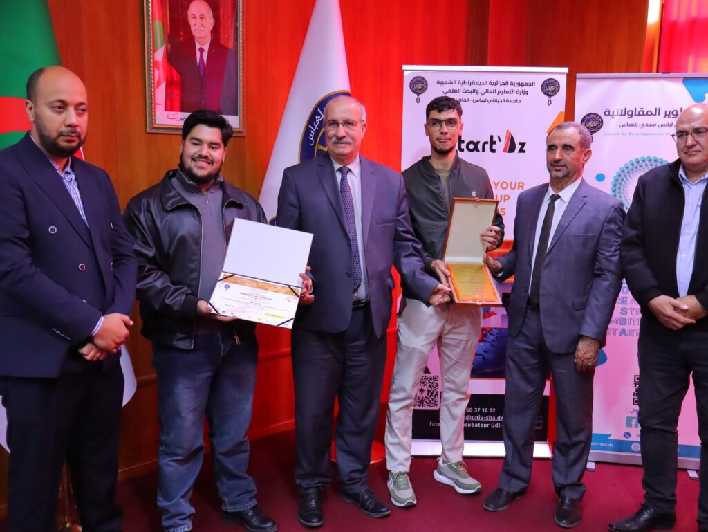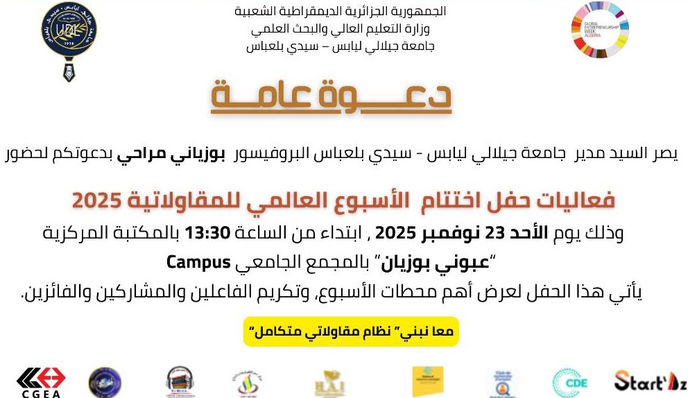 احتضنت قاعة المحاضرات “عبوني بوزيان” بالمكتبة المركزية للمجمع الجامعي يوم 23 نوفمبر 2025 ، فعاليات حفل اختتام الأسبوع العالمي للمقاولاتية 2025 بحضور مدير الجامعة ونوابه، عمداء الكليات، مدير الحاضنة ، مديرة مركز تطوير المقاولاتية ، نائب رئيس الكنفدرالية العامة للمؤسسات الجزائرية، مدير الصيد البحري ، مدير التكوين والتعليم المهنيين، مديرة غرفة الصناعة والتجارة “مكرة” ، إضافة إلى رئيس المجلس الشعبي البلدي لسيدي بلعباس.