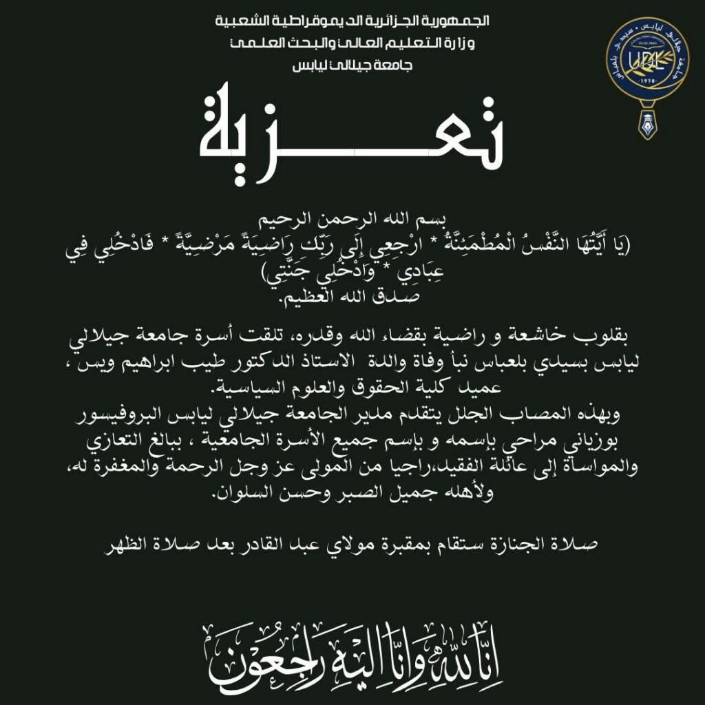 وقدره ، تلفينا نبأ وفاة والدة عميد كلية الحقوق والعلوم السياسية بجامعة جيلالي ليابس، الاستاذ الدكتور طيب إبراهيم ويس .