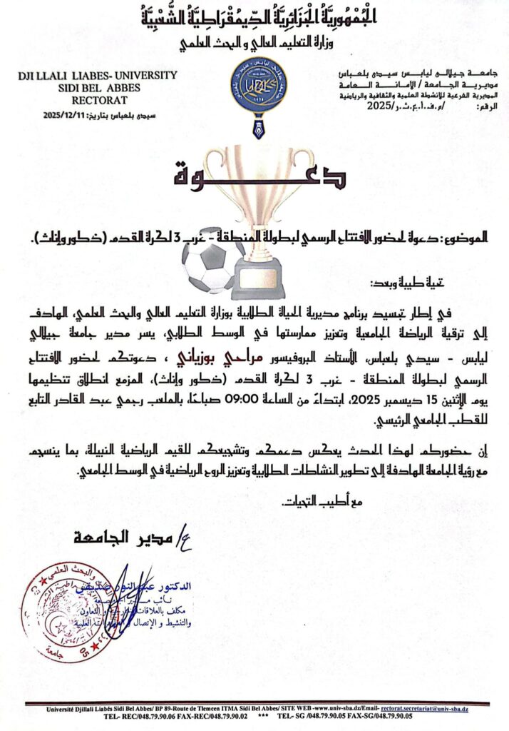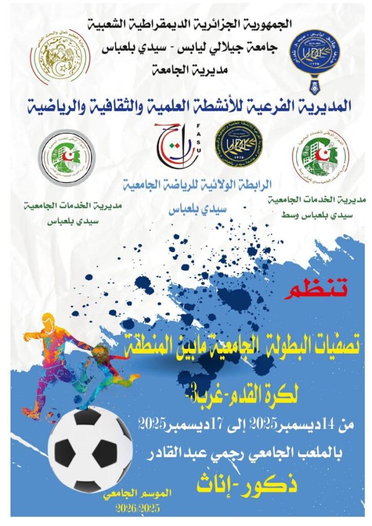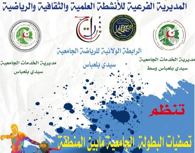 جامعة جيلالي ليابس سيدي بلعباس و بإشراف من المديرية الفرعية للأنشطة العلمية و الثقافية و الرياضية ، تنظم تصفيات بطولة المنطقة -غرب 3-لكرة القدم بمشاركة كل من مديرية الخدمات الجامعية للجامعة و الرابطة الولائية للرياضة الجامعية، على مستوى الملعب الجامعي “رجمي عبد القادر” التابع للقطب الجامعي الرئيسي.