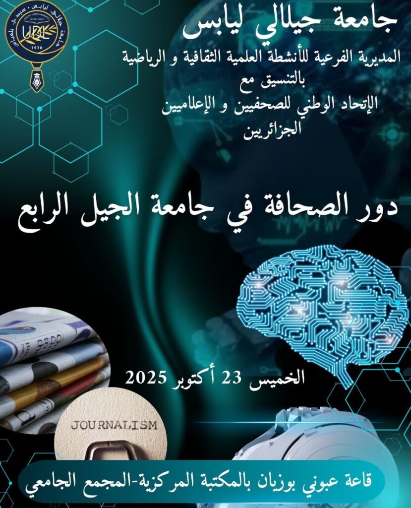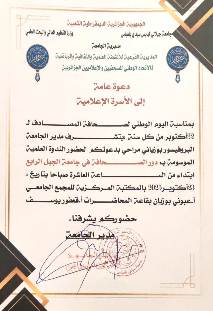 تحت رعاية السيد مدير الجامعة البروفيسور بوزياني مراحي، و بمناسبة اليوم الوطني للصحافة المصادف لـ 22 أكتوبر من كل سنة ، تنظم جامعة جيلالي ليابس سيدي بلعباس، بالتنسيق مع الاتحاد الوطني للصحفيين والإعلاميين الجزائريين، ندوة علمية و احتفالية وفق البرنامج التالي:
