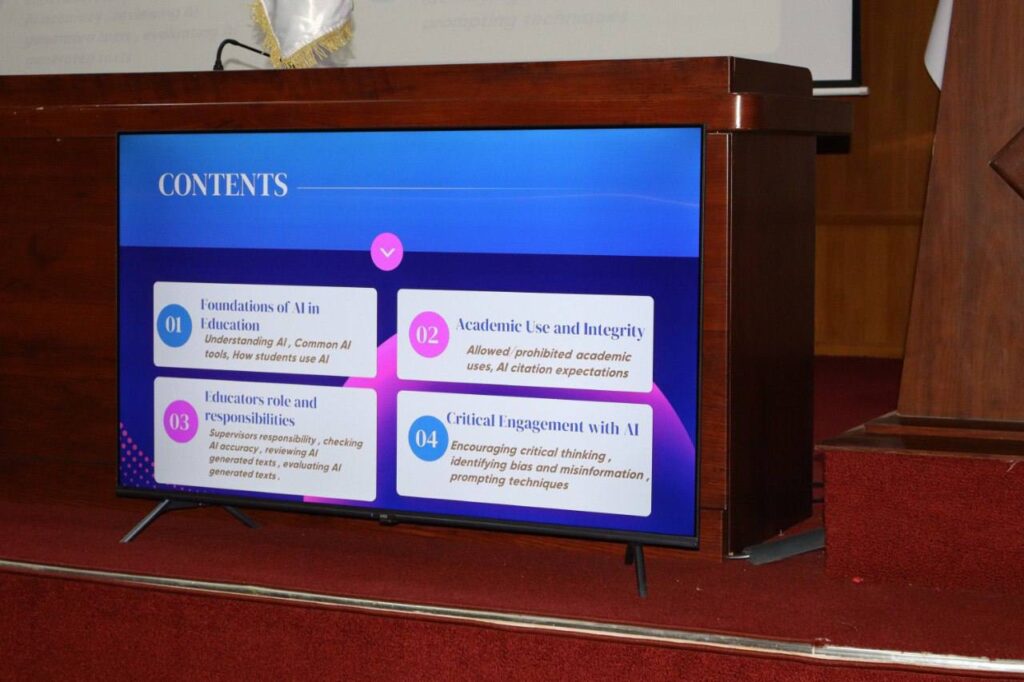 قدّم المركز ضمن فعاليات هذا اليوم محاضرة مميزة بعنوان “الاستخدام الآمن للذكاء الاصطناعي في الممارسات التعليمية”، تناولت أحدث المفاهيم حول دور الذكاء الاصطناعي في تطوير التعليم خاصة في مجال اللغات الأجنبية مع التركيز على الاستخدام الحسن والآمن للتقنيات الحديثة.