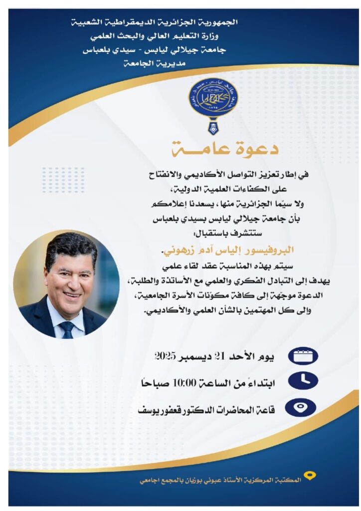 لقاء علمي مع: البروفيسور إلياس آدم زرهوني يوم الأحد 21/12/2025 Date 20 ديسمبر 2025 invitaion_colloque_ilyes_adem_zarhouni_21-12-2025Télécharger Share: Previous post كلية الهندسة الكهربائية: إعلان عن المنح المؤقت للصفقات المتعلقة بالإستشارات رقم 2025/53 إلى 2025/55 20 ديسمبر 2025 You may also like كلية الهندسة الكهربائية: إعلان عن المنح المؤقت للصفقات المتعلقة بالإستشارات رقم 2025/53 إلى 2025/55 18 ديسمبر, 2025 كلية الآداب و اللغات و الفنون : اعلان عن عدم جدوى الإستشارة رقم 2025/29 17 ديسمبر, 2025 كلية الآداب و اللغات و الفنون : إعلان عن المنح المؤقت للصفقات المتعلقة بالإستشارات رقم 26-28 /2025 17 ديسمبر, 2025