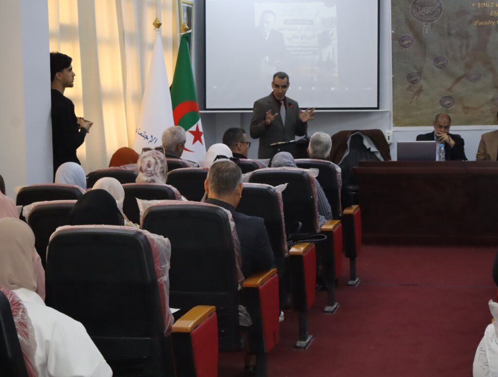 من جهته، أعلن السيد مدير الجامعة البروفيسور بوزياني مراحي الافتتاح الرسمي لليوم الدراسي، مشيداً بأهمية هذه المبادرات العلمية في إحياء الذاكرة الوطنية وتعزيز البحث الأكاديمي. واختُتمت سلسلة الكلمات الافتتاحية بمداخلة عميد الكلية البروفيسور قادة الأحمر، التي تناول فيها شخصية إنريكو ماتي، مبرزاً دوره المحوري في التحولات الاقتصادية، وإسهاماته البارزة في كسر الهيمنة التقليدية على قطاع الطاقة في الجزائر.