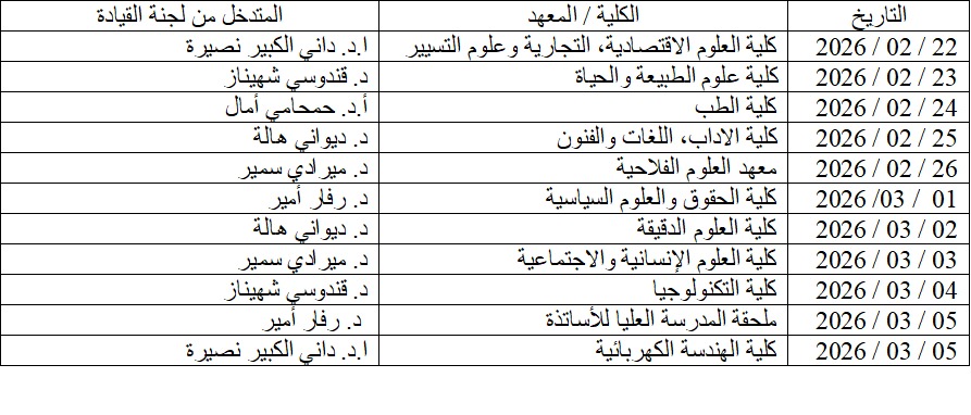 وتستمر هذه الفعاليات خلال الفترة الممتدة من 22 فيفري 2026 إلى غاية 05 مارس 2026، على مستوى كل الكليات ومعهد العلوم الفلاحية من أجل ترسيخ ثقافة الجودة ودعم ديناميكية التحسين المستمر داخل مؤسستنا.