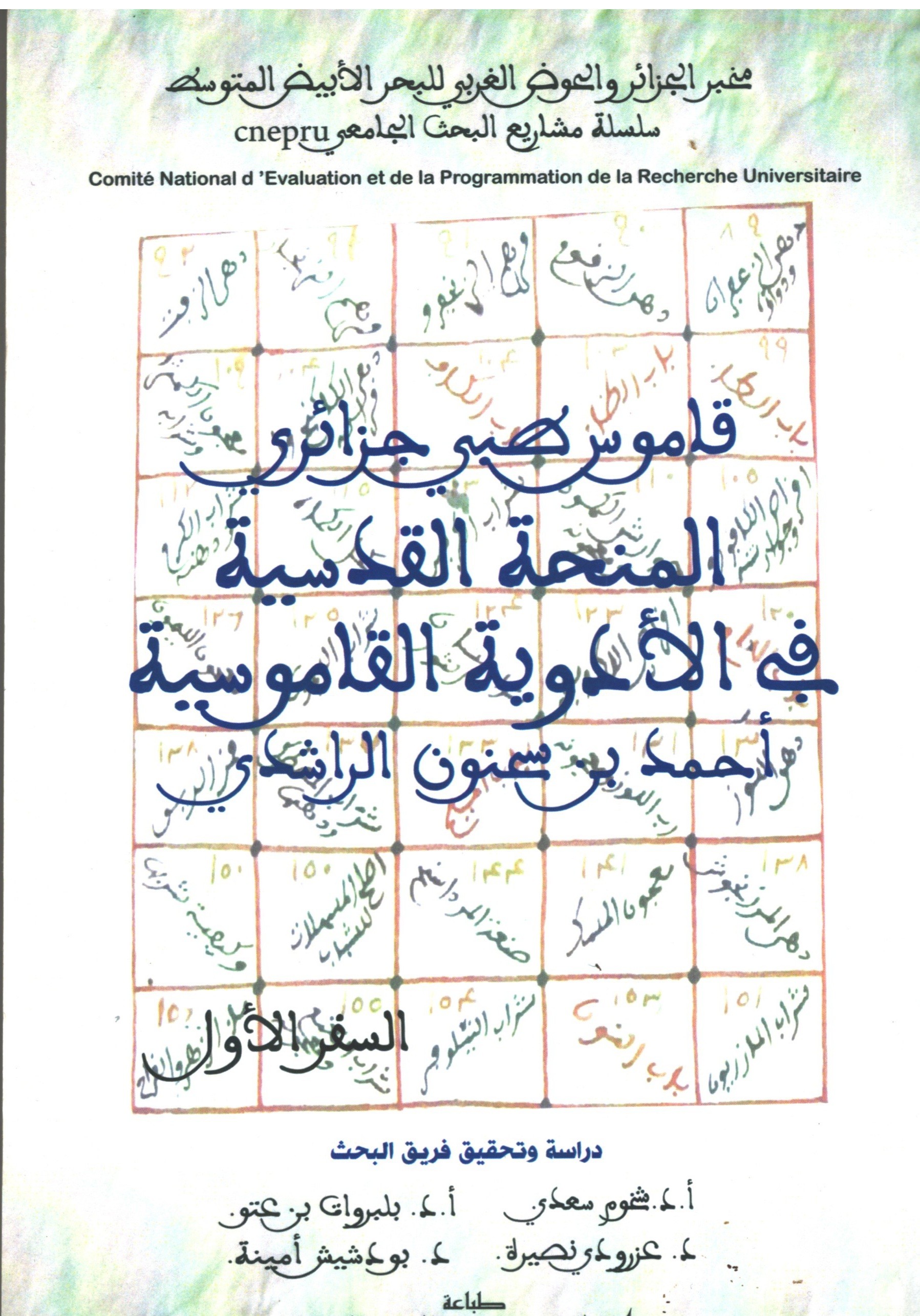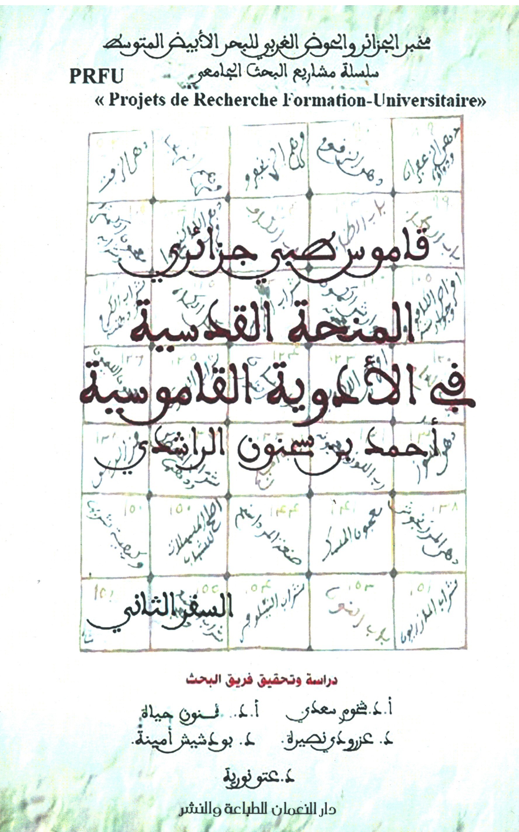 | الاطلاع على الواجهة | أد. شخوم سعدي - أد. بلبروات بن عتو - د. عزرودي نصيرة - د. بوتشيش أمينة | قاموس طبي جزائري المنحة القدسية في الادوية القاموسية أحمد بن سحنون الراشدي (السفر الأول) | 15 |