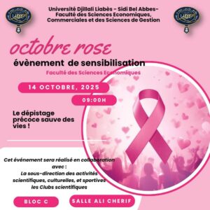 Search Aitensal Club organizes a visit to Sidi Yassine Maternity HospitalReception Box 4 December 2025 Read more » Provincial Training Meeting for General Practitioners on Breast Cancer at Djillali Liabes University – Sidi Bel Abbes 26 October 2025 Read more » Pathos Club’s participation in the Pharmex International Conference at the Palais des Congrès – Oran. 18 October 2025 Read more » Institute of Agricultural Sciences: Pink October 15 October 2025 Read more » Awareness campaigns for early detection of breast cancer across the faculties of Djillali Liabes University, Sidi Bel Abbes 14 October 2025 Read more » Awareness campaigns for early detection of breast cancer across the faculties of Djillali Liabes University, Sidi Bel Abbes 14 October 2025 Read more » World Mental Health Day: Adi Psychological Assistance organizes an awareness activity on the basics of mental health. 12 October 2025 Read more » Pathos Club: Specialized CPR Training Workshop 10 October 2025 Read more » Sylvius Club, in collaboration with Setram Company: launches an awareness campaign on the occasion of “Pink October” 2 October 2025 Read more » Pink October 2025 1 October 2025 Read more » Sylvius Club warmly welcomes new students at the Faculty of Medicine 29 September 2025 Read more » The 4th National Pharmaceutical Day 27 September 2025 Read more » Welcome Ceremony 2025 organized by Club Pathos 27 September 2025 Read more » Pathos Club organizes a Welcome Day for new students at the Faculty of Medicine 24 September 2025 Read more » Participation of Pathos and Sylvius Clubs in the MDEX Conference 18 September 2025 Read more » First scientific partner between MDEX and the Faculty of Medicine of Sidi Bel Abbès 12 August 2025 Read more » Scientific meeting of the PATHOL THERAP TEAM 8 July 2025 Read more » Letansal Club: First Edition of the Scientific Day of General Medicine 24 June 2025 Read more » The Power of Simple Herbs 10 June 2025 Read more » Sylvius Club: The Power of Simple Herbs 10 June 2025 Read more » A SCIENTIFIC EVENT ON THE DANGERS OF SMOKING AND ITS DIRECT LINK TO SEVERAL TYPES OF CANCER 4 June 2025 Read more » Elite Day 18 May 2025 Read more » Down Syndrome Awareness Event 6 April 2025 Read more »