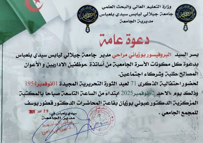 L’Université Djilali Liabès de Sidi Bel Abbès a l’honneur de vous inviter à participer à son programme commémoratif, incluant une série d’activités et de célébrations honorifiques.