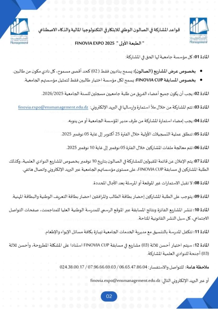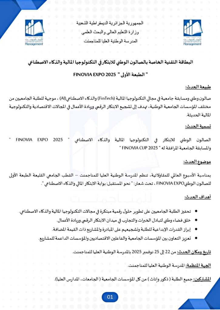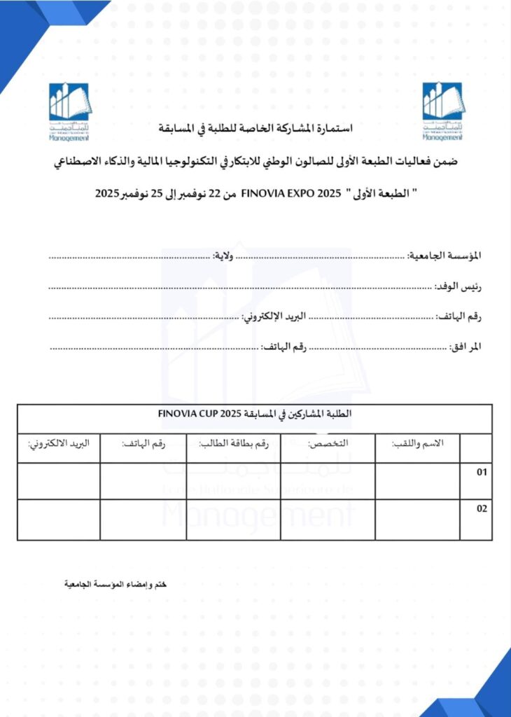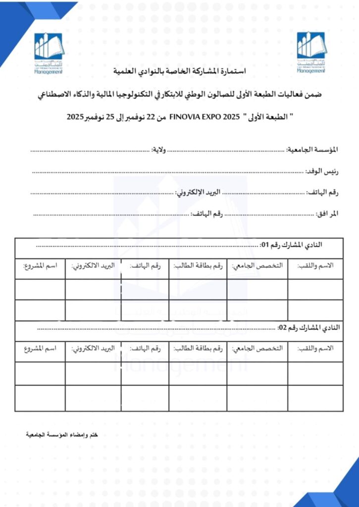 Organisation du Salon national de l’innovation en technologies financières et en intelligence artificielle Date 20 octobre 2025 Organisation du Salon national de l’innovation en technologies financières et en intelligence artificielle Share: ELGHODASSE Halima Previous post Faculté de Génie Electrique: Avis des Consultations N° 39-40-41/2025 20 octobre 2025 You may also like Faculté de Génie Electrique: Avis des Consultations N° 39-40-41/2025 20 octobre, 2025 Faculté de Génie Electrique: Avis d’Attribution Provisoire de Contrat de la Consultation N° 36/2025 20 octobre, 2025 Campagne nationale de reboisement des universités 20 octobre, 2025