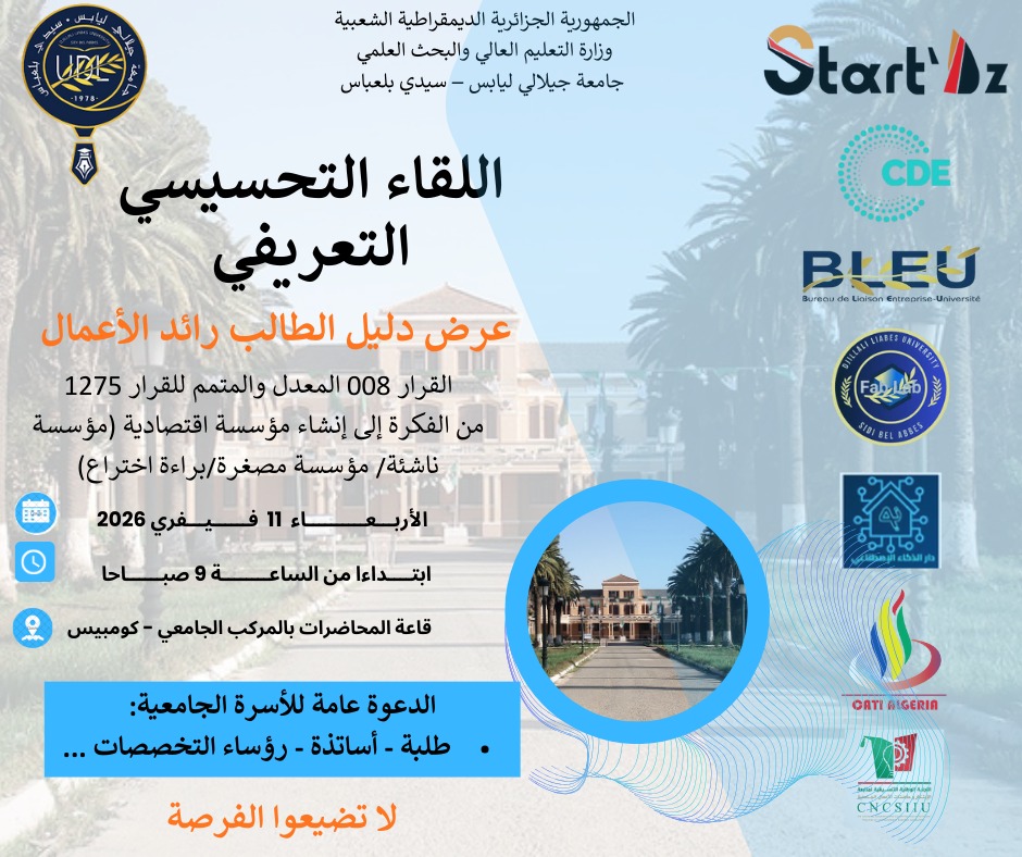 في إطار تنفيذ البرنامج الوطني للتحسيس بآليات القرار الوزاري رقم 1275 المعدّل والمتمم، يشرفني أن أعلمكم بتنظيم يوم تحسيسي لفائدة الأسرة الجامعية، وذلك وفق المعطيات التالية: