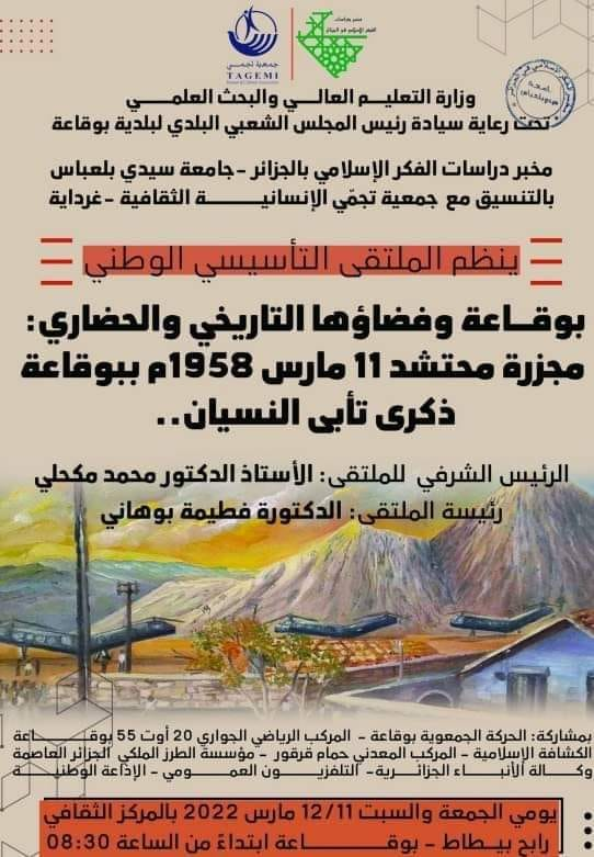 مخبر الجزائر تاريخ و مجتمع في الحديث و المعاصر و مخبر الفكر الاسلامي في الجزائر بالتنسيق مع الاذاعة الوطنية ينظمان ندوة تاريخية موسومة ب: الاعلام و الدعاية في الثورة التحريرية -لائحة من لوائح ميثاق الصومام- يوم الخميس 27 أكتوبر 2022.