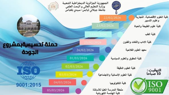Djilali Liabès University - Sidi Bel Abbès announces the launch of a comprehensive awareness campaign within the quality project according to the international standard ISO 9001:2015, aimed at enhancing university performance efficiency and developing educational and administrative services.