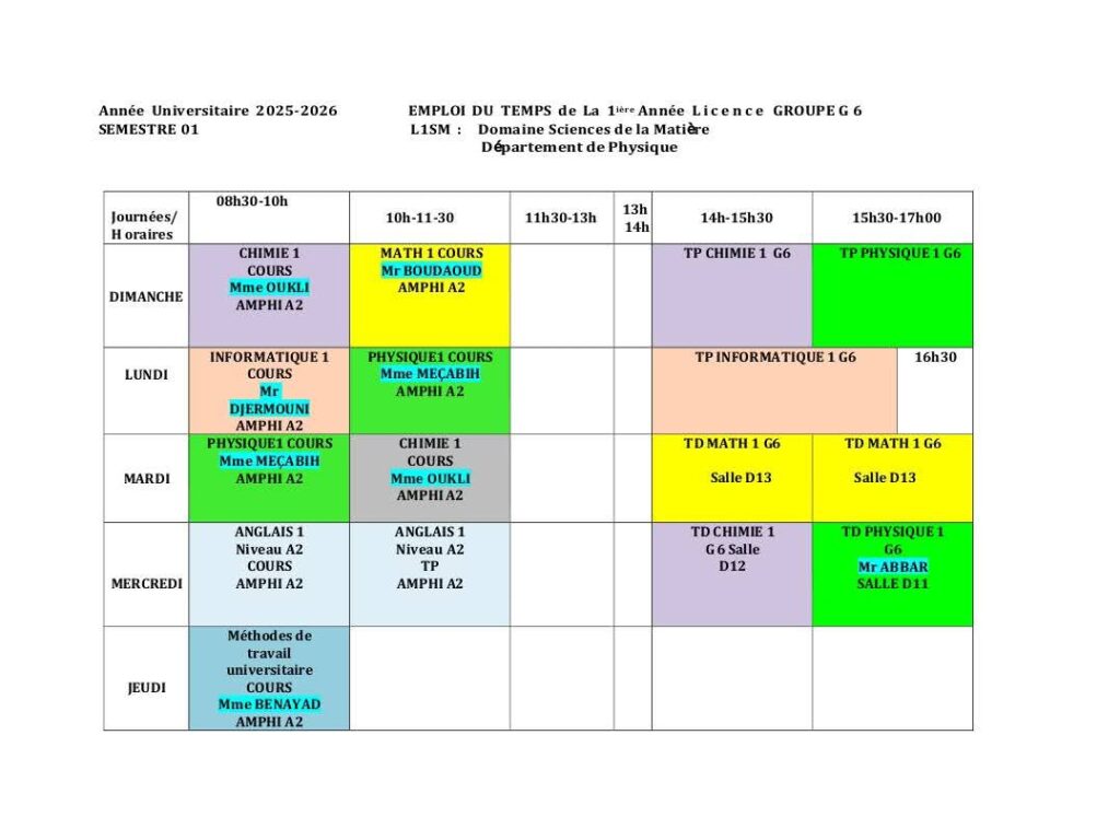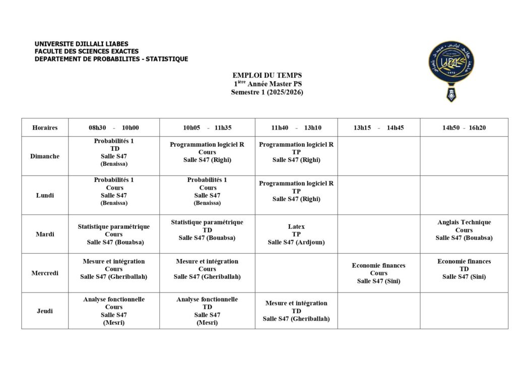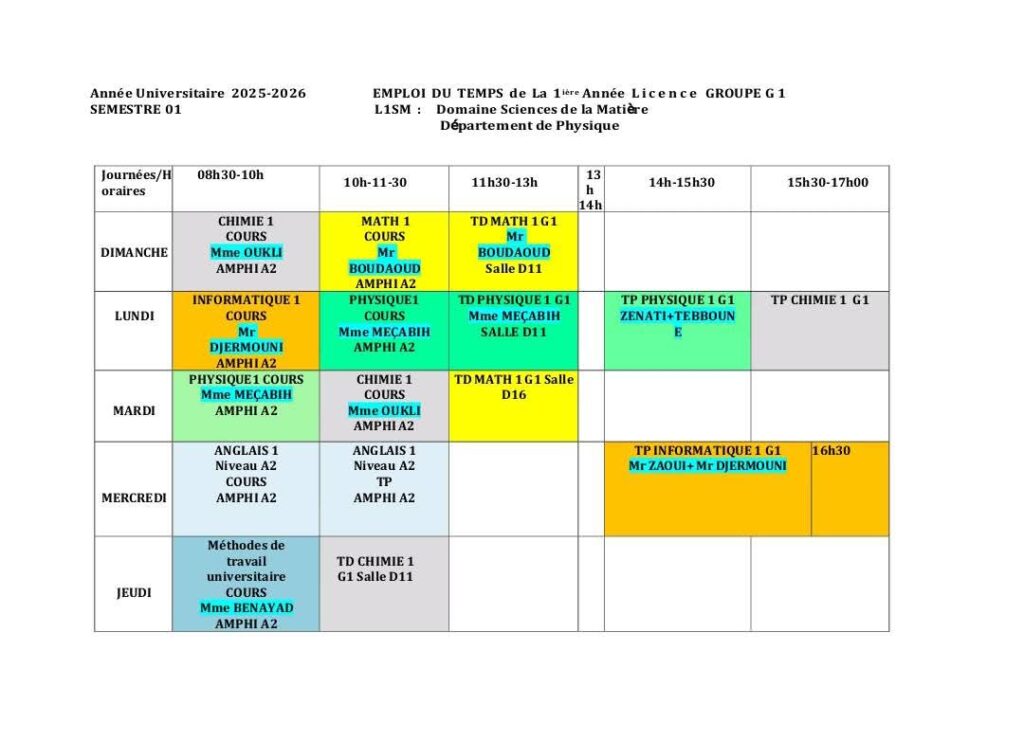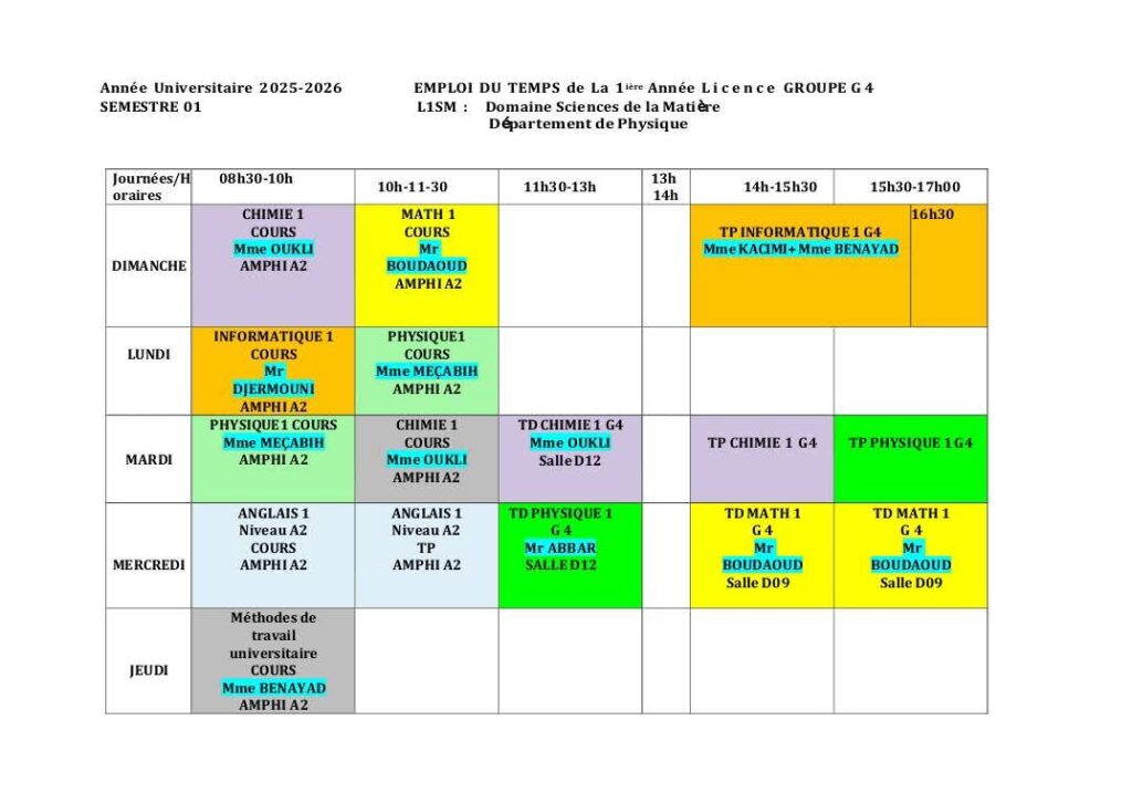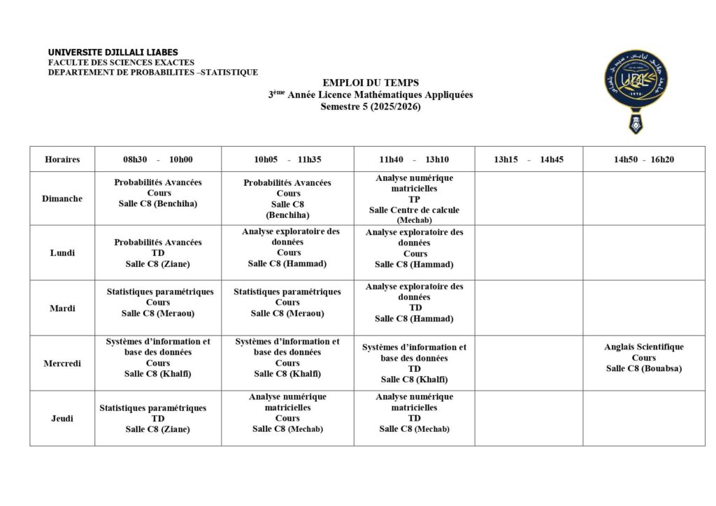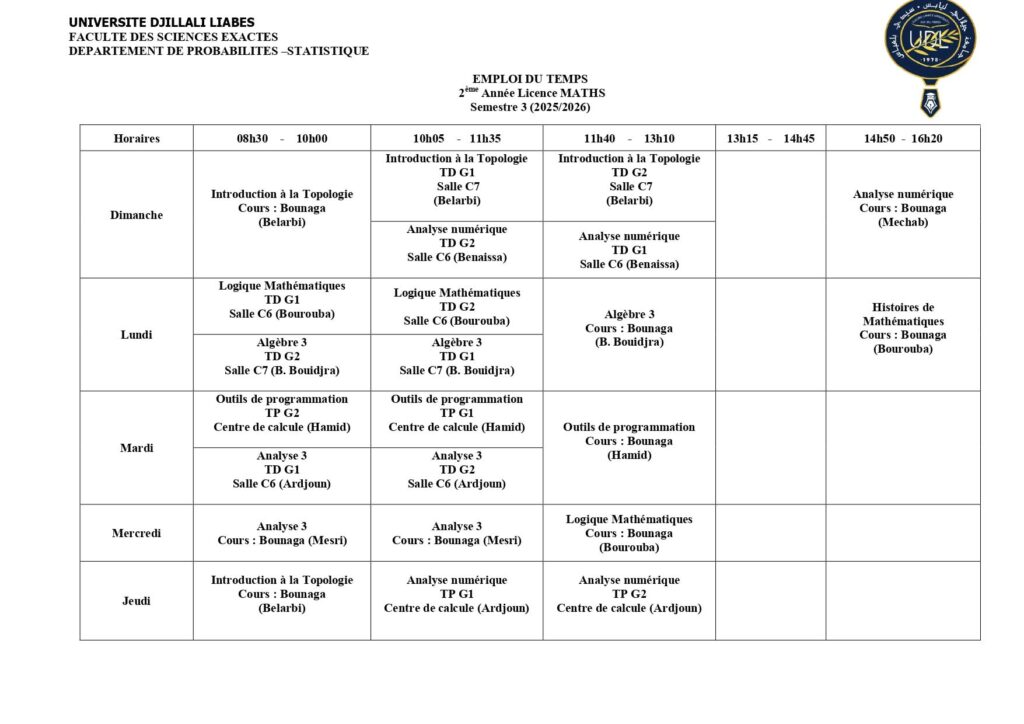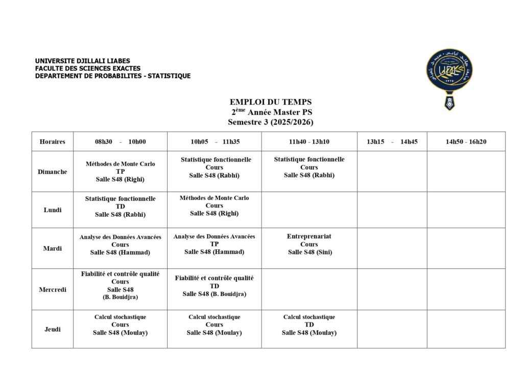 Emploi du temps Département de mathématiques Département de probabilités et statistiques Département de physique Département d’informatique