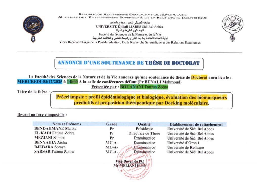 تعلن كلية علوم الطبيعة والحياة بجامعة جيلالي ليابس – سيدي بلعباس عن مناقشة أطروحة دكتوراه للطالبة بوعنانـي فاطمـة زهـرة، وذلك يوم: