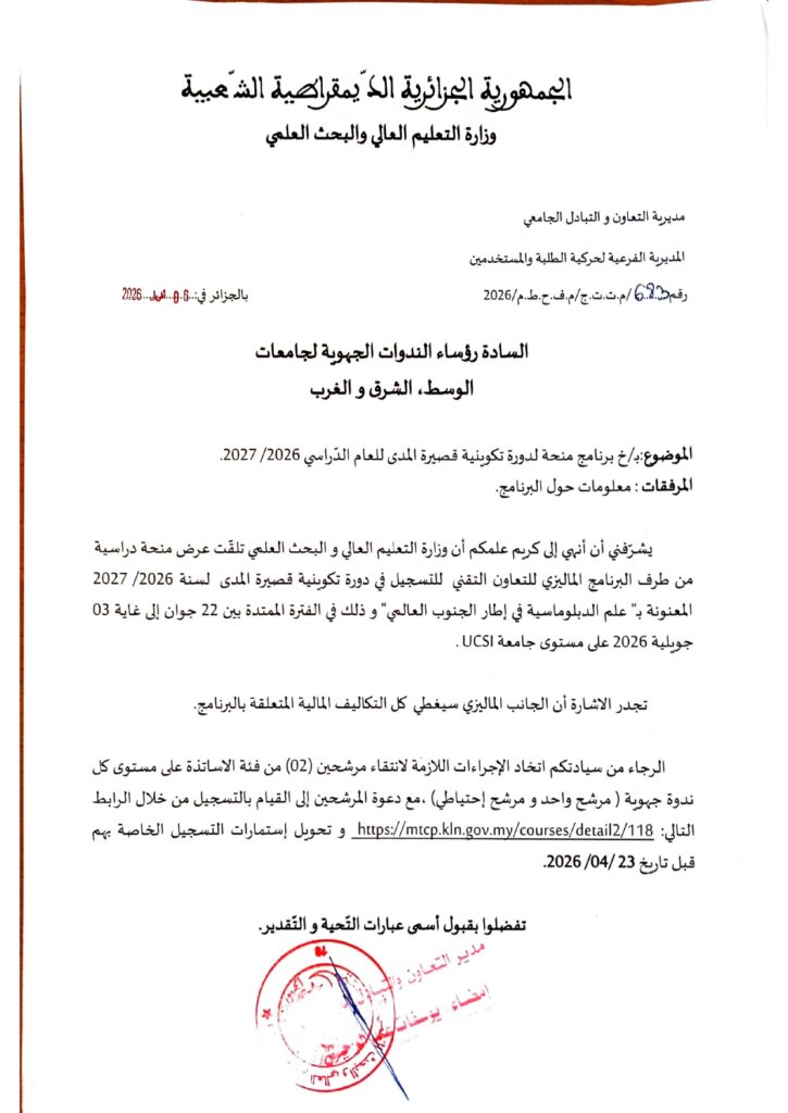 في إطار تعزيز التعاون الدولي، يشرفنا إعلامكم بفتح باب الترشح للاستفادة من برنامج تكويني في دبلوماسية الجنوب العالمي بماليزيا، والموجه لفائدة الأساتذة.
