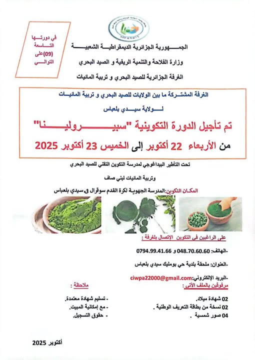 تُعلم الفرقة المختصة في تربية المائيات بوزارة الصيد البحري والمنتجات الصيدية، بالتنسيق مع مديرية الصيد البحري لولاية سيدي بلعباس، عن تأجيل الدورة التكوينية حول “سبيرولينا” إلى يوم الخميس 23 أكتوبر 2025 بدلًا من الأربعاء 22 أكتوبر 2025.