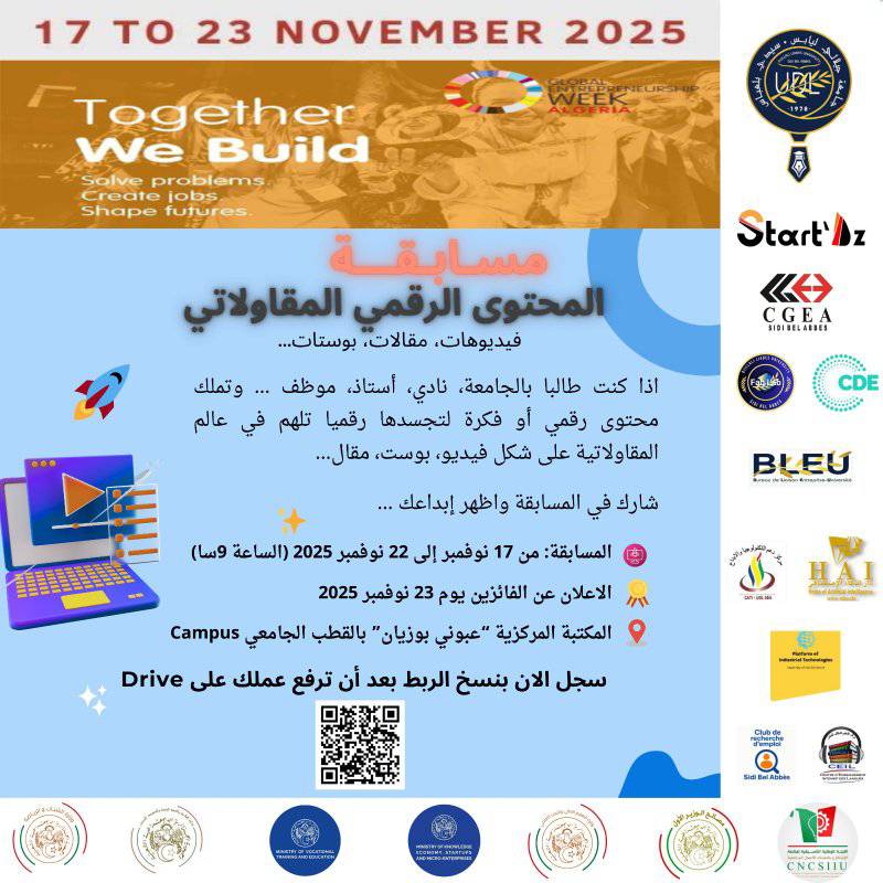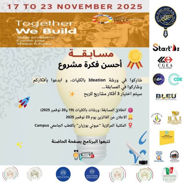 في إطار الاحتفال بالأسبوع العالمي لريادة الأعمال، تدعوكم الحاضنة الجامعية للمشاركة في مسابقة أحسن فكرة مشروع.