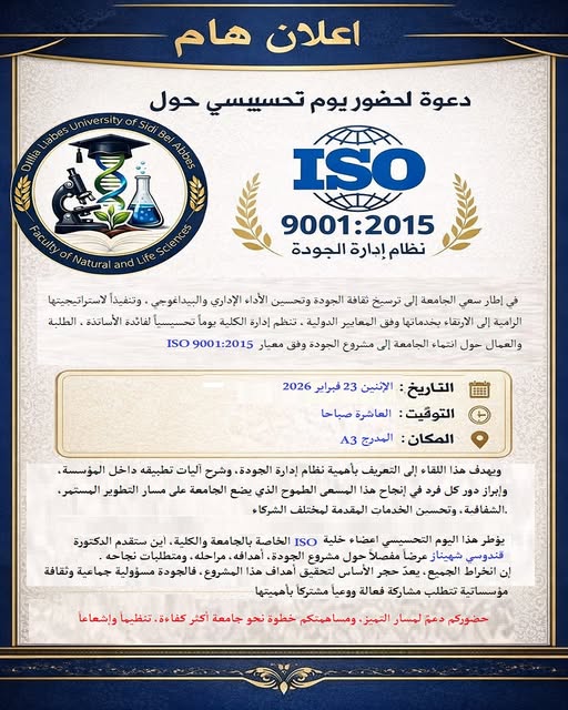 Dans le cadre du renforcement de la culture qualité et de l’amélioration des performances administratives et pédagogiques, la Faculté des Sciences de la Nature et de la Vie de l’Université Djillali Liabès organise une journée de sensibilisation au système de management de la qualité ISO 9001:2015 au profit de la communauté universitaire.