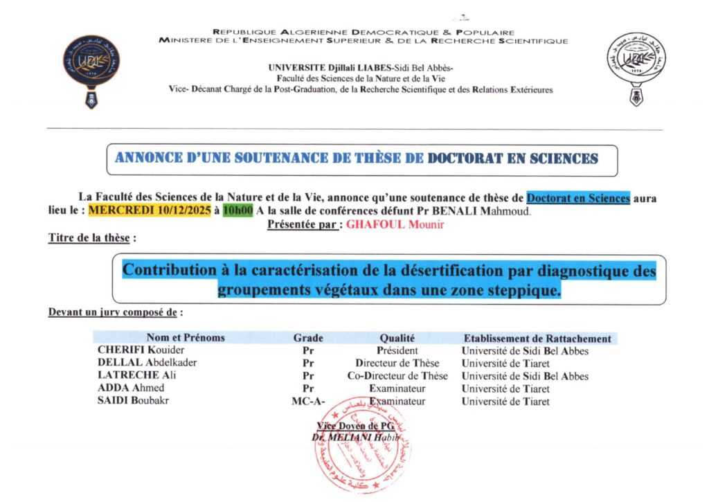La Faculté des Sciences de la Nature et de la Vie annonce la soutenance d’une thèse de doctorat en sciences, présentée par GHAFOUL Mounir, intitulée :