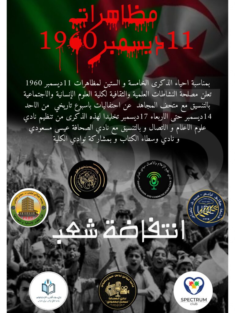 بمناسبة إحياء الذكرى الخامسة و الستين لمظاهرات 11 ديسمبر 1960، تعلن مصلحة النشاطات العلمية و الثقافية لكلية العلوم الانسانية و الاجتماعية بالتنسيق مع متحف المجاهد عن تنظيم إحتفاليات بأسبوع تاريخي إبتداء من يوم الأحد 14 ديسمبر حتى 17 ديسمبر تخليدا لهذه الذكرى المجيدة، من تنظيم نادي علوم الإعلام و الإتصال و بالتنسيق مع نادي الصحافة عيسى مسعودي و نادي وسطاء الكتاب ومشاركة نوادي الكلية.