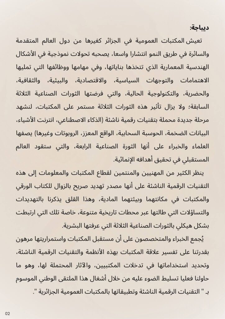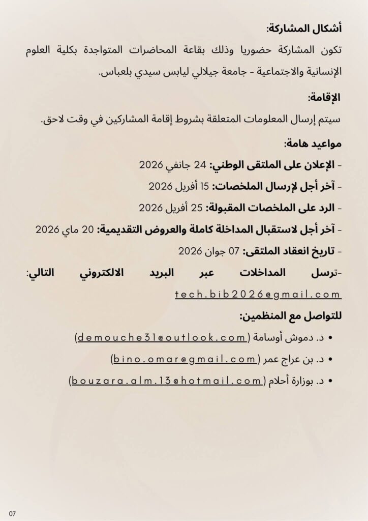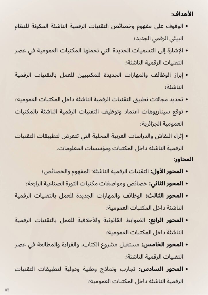 بمناسبة اليوم الوطني للكتاب و المكتبة، تتشرف شعبة علم المكتبات و المعلومات -قسم العلوم الإنسانية – بكلية العلوم الإنسانية و الاجتماعية -جامعة جيلالي ليابس – سيدي بلعباس ،بدعوة الأساتذة و الباحثين، و طلبة الدكتوراه للمشاركة في أشغال الملتقى الوطني الموسوم ب: التقنيات الرقمية الناشئة و تطبيقاتها بالمكتبات العمومية الجزائرية