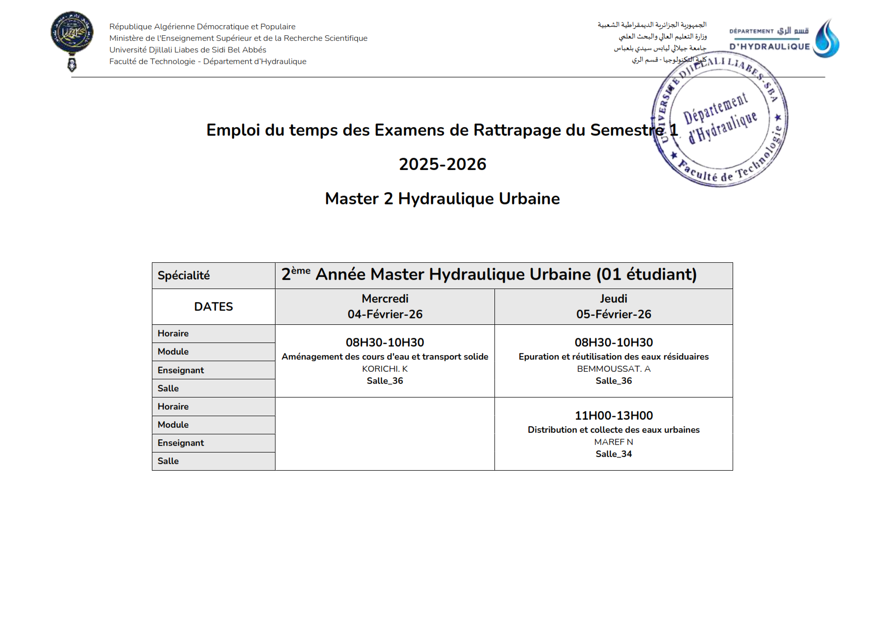 Programme d’examen La charte des examens du premier semestre de l'année universitaire 2025/2026 Département des Enseignements de Base en Sciences & Technologies(examens de remplacement-dette) 1ère Année -dette 1ère Année - remplacement 2éme Année -dette 2éme Année -remplacement 1ère Année -Listes 2éme Année -Listes Département d'Hydraulique(emploi du temps des examens de rattrapage du master 2 hydraulique urbaine) Département d'Hydraulique(examens de remplacement) Master 2 Master 1 Département de Génie Mécanique(examens de remplacement) Licence -Master - Ingéniorat Département de Génie civil et Travaux Public (examens de remplacement-dette) Licence Master 1 (Dette) Master 1 (remplacement) Master 2 Architecture Ingéniorat emploi du Temps de remplacement du module Tunnels et ouvrages souterrains . Département des Enseignements de Base en Sciences & Technologies 1ère Année Listes 1ère Année 2éme Année Listes 2éme Année 1er Année- dette -list 2éme Année - dette -list